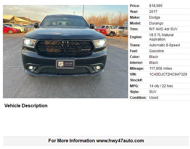 Plus, rest assured knowing there is a Carfax report available for this vehicle, giving you peace of mind about its history. Don’t miss out on your chance to own this versatile and well-equipped 2017 Dodge Durango - the perfect combination of style, safety, and performance.